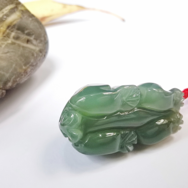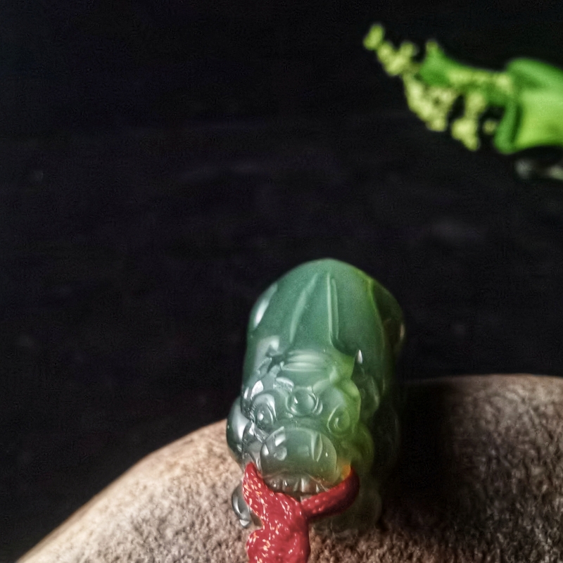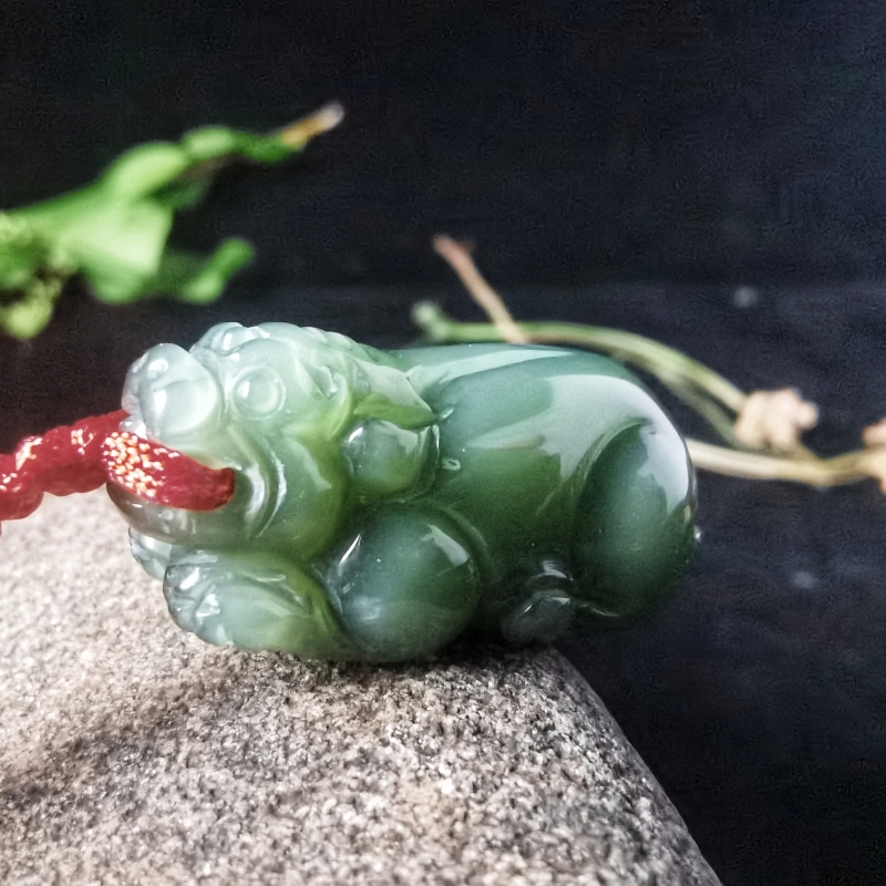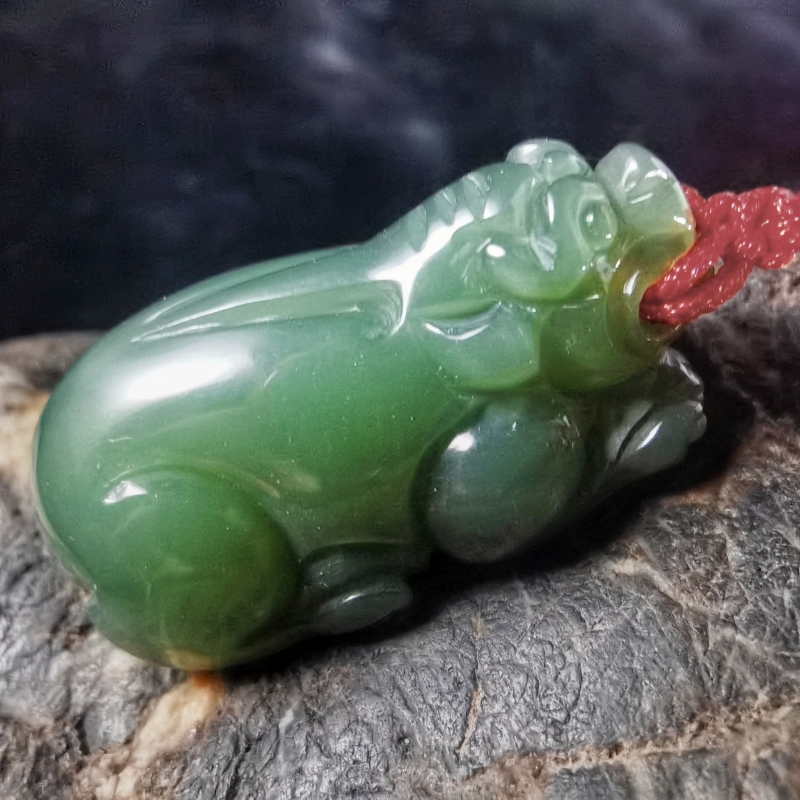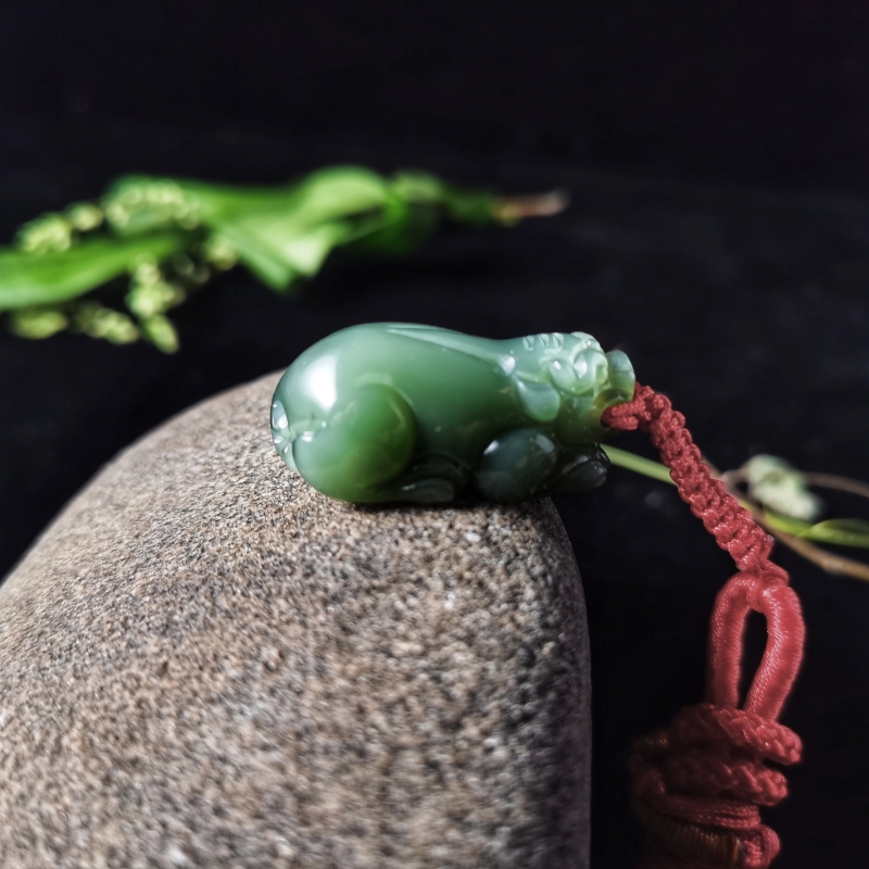 此款为和田玉貔貅挂件,玉质细腻莹润,巧雕瑞兽,刻画细致生动,体态圆滚饱满,兽身线条流畅,虽伏身静卧,却威猛霸气,姿态刚劲,有威慑感,整器小巧精致,令人爱不释手,瑞兽神通广大,可护佑世人平安康健,有招财进宝,财运亨通之意。