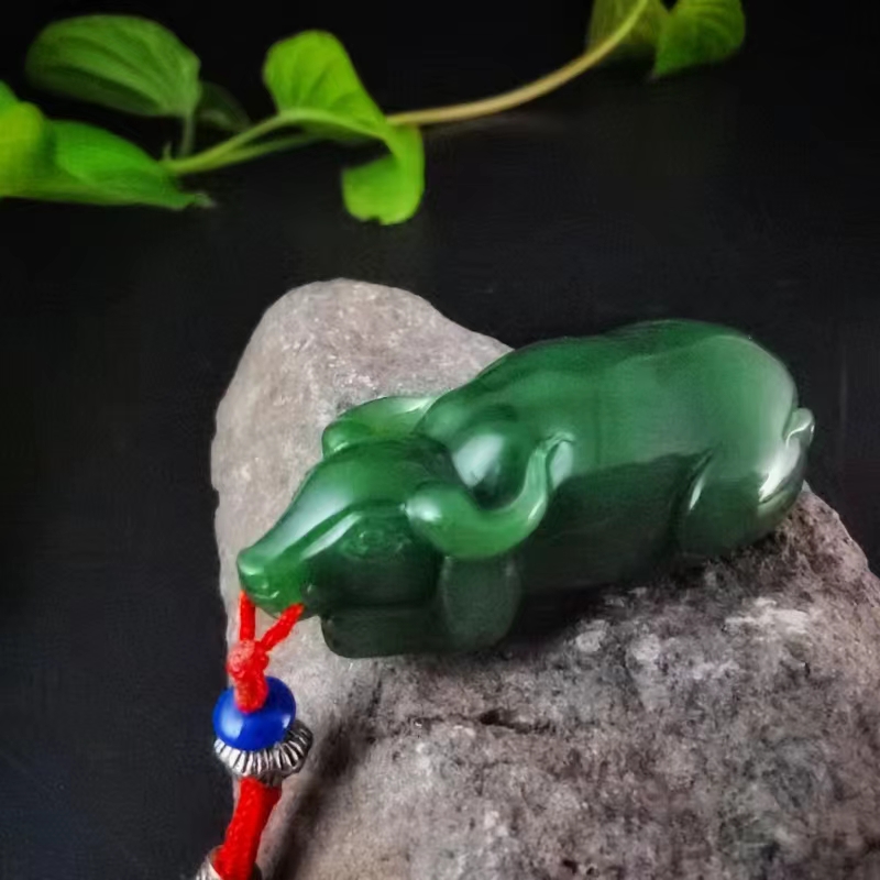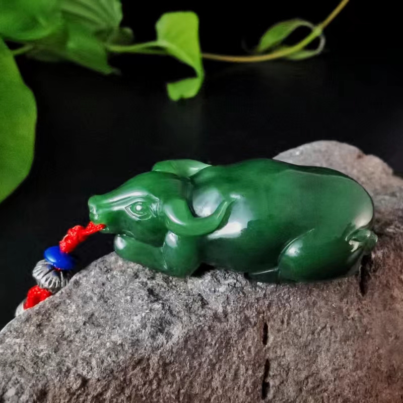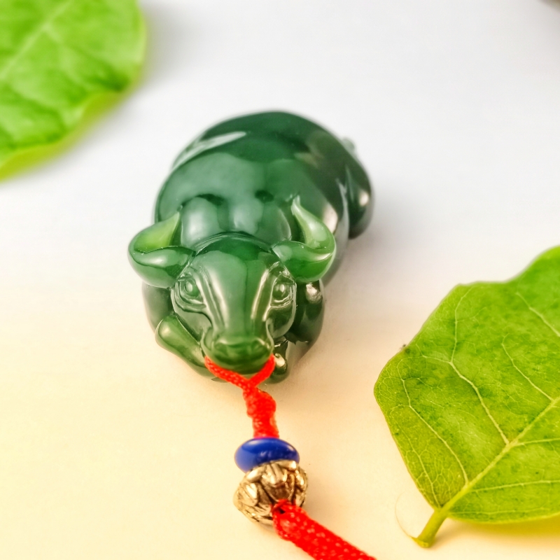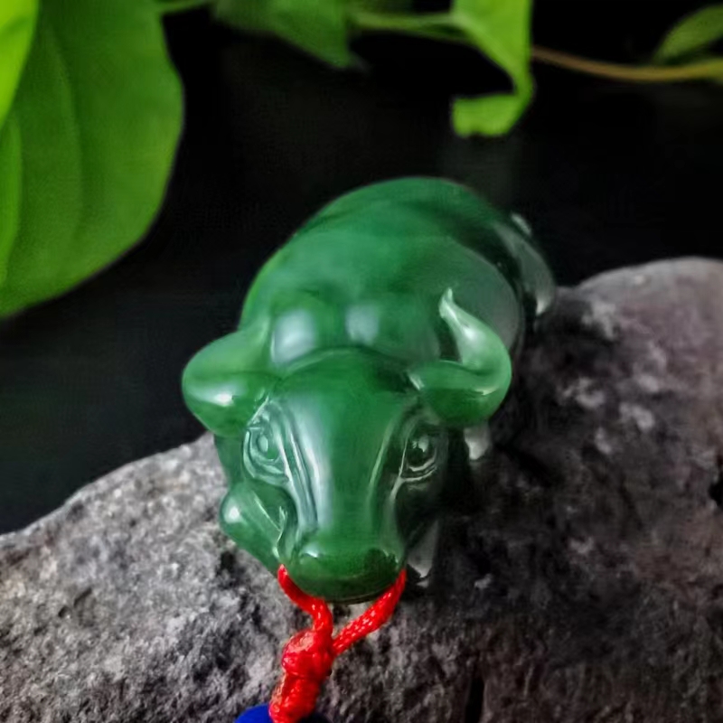 此款为和田玉【牛气冲天】挂件,玉质油亮细腻,色泽清新靓丽,精琢神牛,造型立体生动,牛角扶摇而上,双目炯炯有神,身姿圆润健硕,整器灵韵毕现,大气而庄重。
